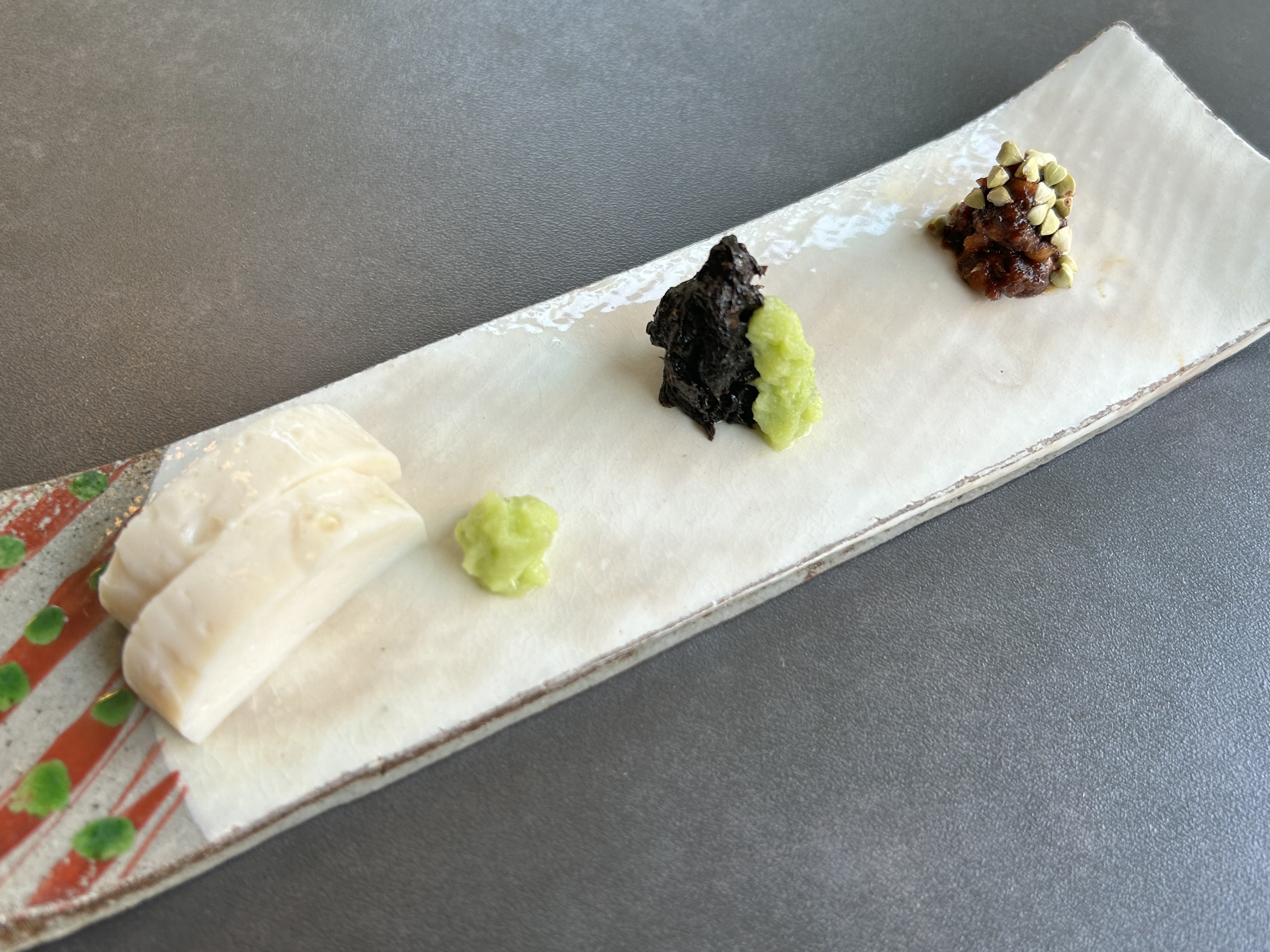 蕎麦屋の酒肴三種「板わさ・のりわさ・そば味噌」