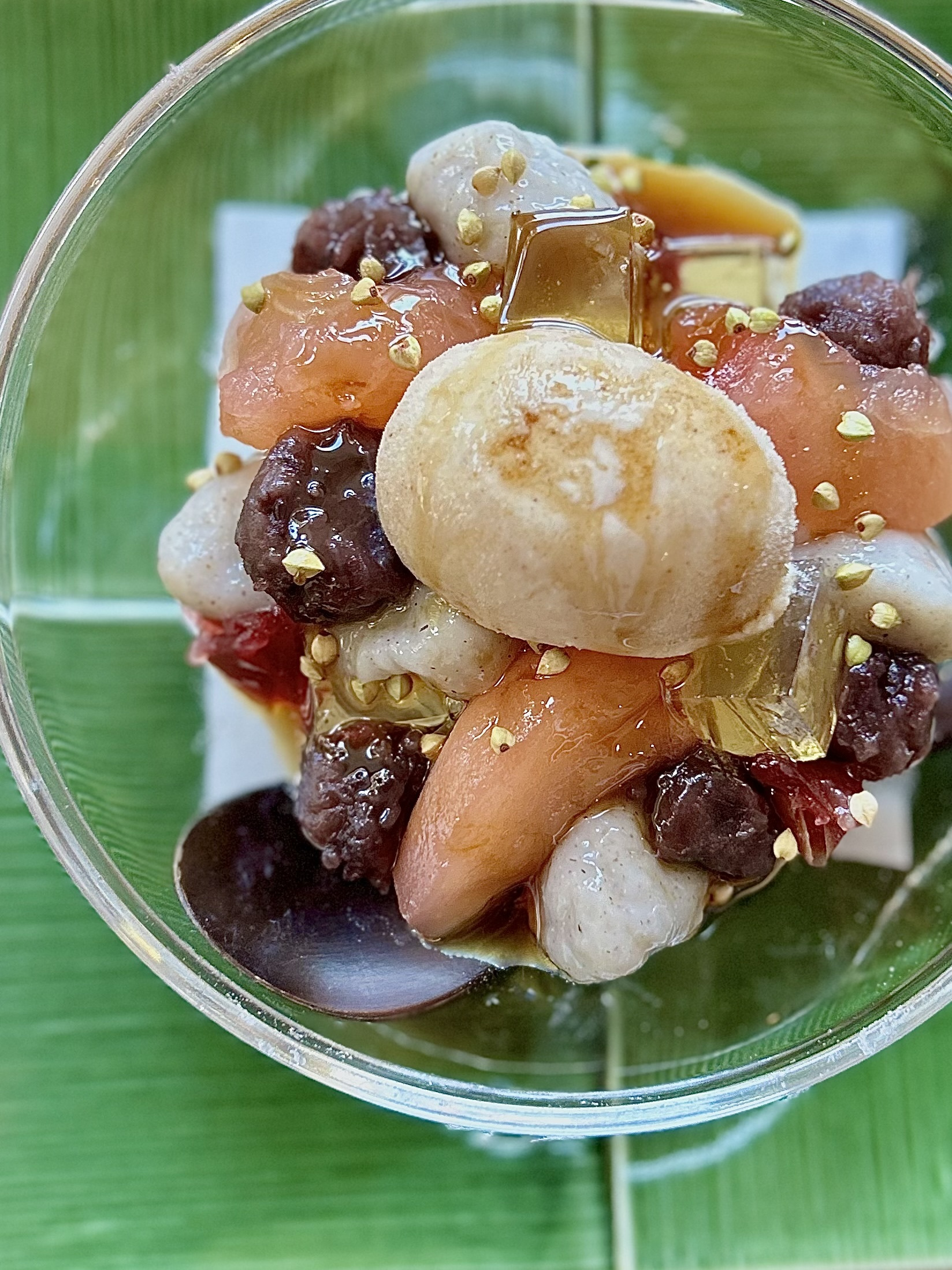 そば白玉とそば茶ゼリーのクリームあんみつ(紅玉りんご)
